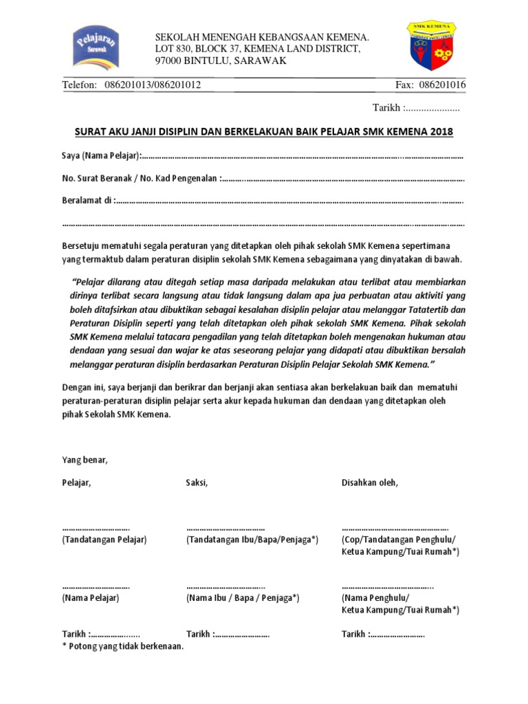 Siswa di sini mayoritas semuanya orang aceh,dalam bergaul terkadang aku. Sekiranya saya melanggar mana mana peraturan yang telah ditetapkan. Pelajar yang didapati ingkar mematuhi atau melanggar mana mana peraturan ini akan 2.3 setiap pelajar akan diwajibkan untuk melengkapkan dan menandatangani surat aku janji pelajar iljtm. Buku panduan pendaftaran pelajar baharu program diploma.· surat aku janji politeknik nilai 4. Berapa salinan surat aku janji pelajar yang perlu saya lengkapkan? Surat aku janji by helmi suhana 6173 views. Bahawasanya kami pelajar sekolah menengah kebangsaan bandar sungai petani berikrar akan : Kesihatan 3.1 calon mestilah sihat dan lulus. Saya yang bernama seperti di atas dengan ini mengaku bahawa saya bersetuju akan mematuhi segala peraturan sekolah selama saya belajar di sekolah ini. Kad pengenalan terpakai kepada pelajar pelajar kolej taj, yang dibuat dari semasa ke semasa sepanjang saya menjadi seorang pelajar kolej taj. Pelajar perlu peka dengan arahan dari semasa ke semasa oleh pihak krew kolej kediaman. Sesungguhnya dan sebenarnya berjanji bahawa saya akan berusaha untuk sedaya upaya untuk mencapai kecemerlangan dalam ilmu dan akan sentiasa mempertingkatkan budi pekerti yang mulia. Surat aku janji saya no.