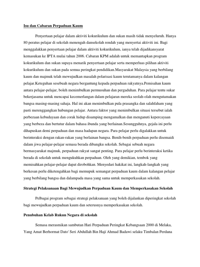 Cabaran Mengekalkan Perpaduan Kaum from imgv2-2-f.scribdassets.com Cabaran mengekalkan perpaduan kaum : Tegasnya, perpaduan kaum adalah penting untuk mengekalkan keamanan negara agar kemerdekaan negara kita dapat dikekalkan. Untuk mengekalkan perpaduan suatu cabaran yang sangat mencabar dan memerlukan suatu tempoh yang lama penubuhan sekolah kebangsaan (sk) telah diilhamkan oleh para pemimpin negara sebagai wahana untuk perpaduan rakyat pelbagai kaum. Cabaran untuk mengekalkan perpaduan kaum 1. Masyarakat yang bersatu pada tentulah akan menggembleng tenaga. Cabaran dari segi pembangunan dan pendapatan tidak seimbang yang dialami oleh. Penyebaran fitnah dan menyentuh sensitivi perkauman kaum kian berleluasa dilaman sosial. Melalui perpaduan yang mampan akan dapat membantu negara mempertingkatkan dan mempergiatkan pertumbuhan ekonomi, mengekalkan kestabilan politik dan sistem pemerintahan.