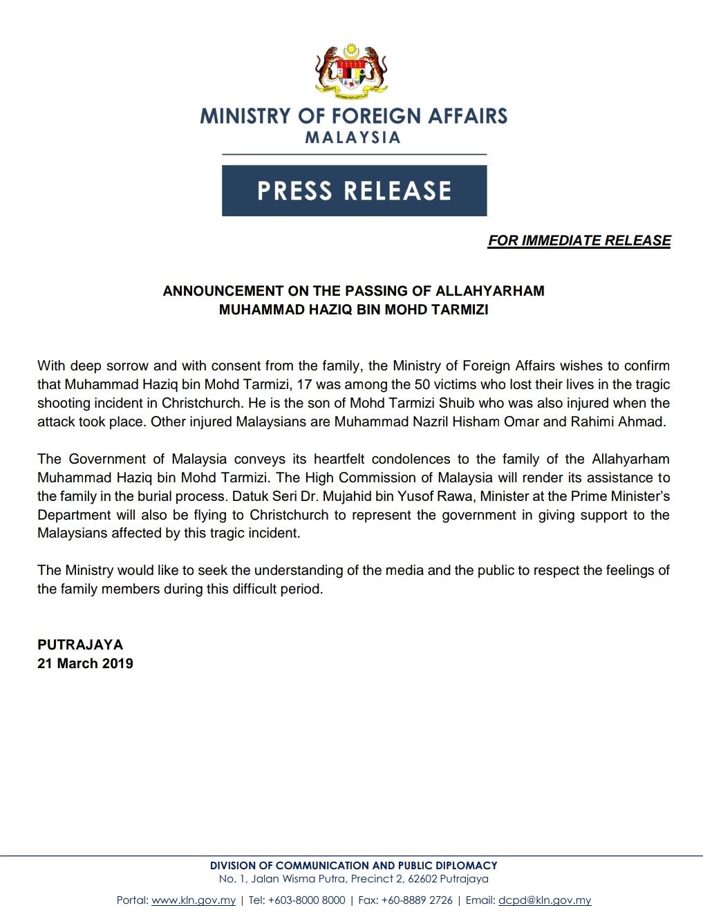 Pengerusi jawatankuasa kebajikan, alam sekitar dan masyarakat penyayang pulau pinang, phee boon poh, berkata berita kematian mohd haziq, 17, itu juga sudah diterima wisma putra. Haziq tarmizi, 17, with his father, mohd tarmizi shuib, who was also injured in the incident. Kementerian luar mengesahkan, rakyat malaysia, muhammad haziq mohd tarmizi, 17, adalah antara 50 mangsa yang kehilangan nyawa dalam insiden tembakan di christchurch, minggu lalu. With deep sorrow and with consent from the family, the ministry of foreign affairs wishes to confirm that muhammad haziq bin mohd tarmizi, 17 was among the 50 victims who lost their lives in the tragic shooting incident in christchurch. Jenazah allahyarham mohd haziq mohd tarmizi, 17 tahun selamat dikebumikan di memorial park cemetery bromley di linwood, christchurh selepas zohor waktu tempatan, hari ini.